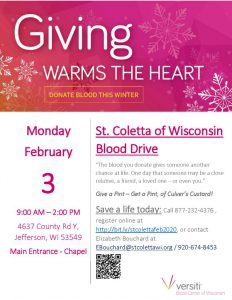St. Coletta is hosting a Blood Drive for anyone in the community on Monday, February 3rd from 9am – 2pm.